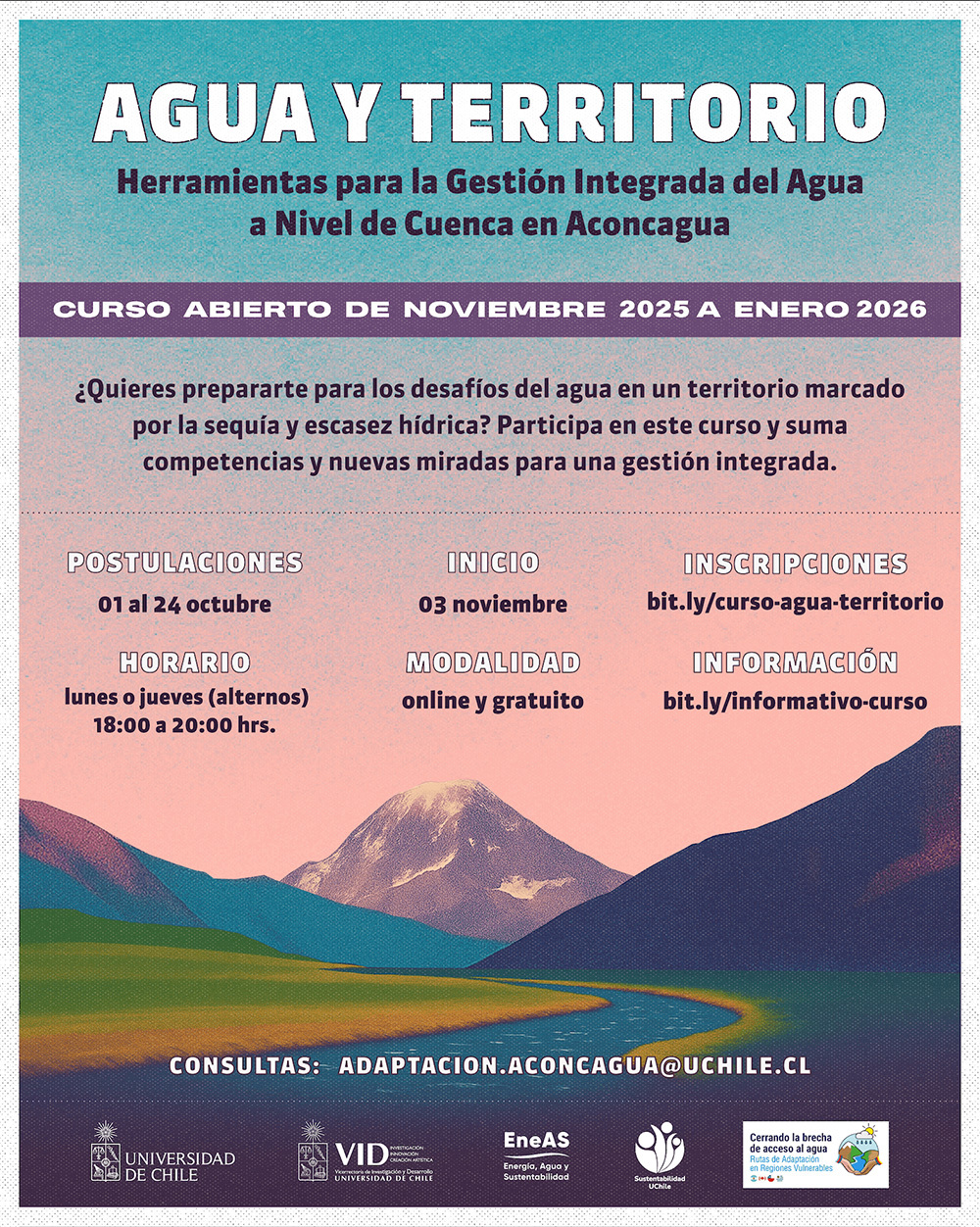 En el marco del compromiso de la Universidad de Chile con el desarrollo sustentable y la formación de capacidades para enfrentar los desafíos socioambientales del país, se abre la convocatoria para participar en la versión piloto del Curso de Abierto “Agua y Territorio: Herramientas para la Gestión Integrada del Agua a Nivel de Cuenca en Aconcagua”.
